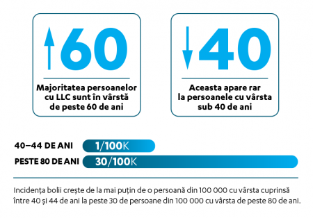 ● Vârsta. Riscul de apariție a LLC-ului crește odată cu vârsta. Majoritatea persoanelor cu LLC au peste 60 de ani. Aceasta apare rar la persoanele cu vârsta sub 40 de ani. Incidența bolii crește de la mai puțin de o persoană din 100 000 la cei cu vârsta cuprinsă între 40 și 44 de ani la peste 30 de persoane din 100 000 la cei cu vârsta de peste 80 de ani. Pacienții mai în vârstă tind să prezinte rezultate mai nefavorabile din cauza faptului că sunt diagnosticați cu o formă de LLC mai agresivă și a incapacității de a tolera tratamentul și simptomele bolii.