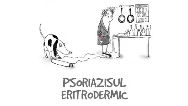 Psoriazisul eritrodermic este cea mai gravă formă a acestei boli. În cazul psoriazisului eritrodermic, scuamele eritematoase și descuamative de pe piele acoperă cea mai mare parte a suprafeței corporale. Pacienții pot avea febră și dureri articulare care agravează pruritul și descuamarea pielii. Ganglionii limfatici periferici pot fi măriți. Psoriazisul eritrodermic se poate dezvolta din cauza psoriazisului vulgar și a unei infecții concomitente. Dacă nu este tratat sau este tratat necorespunzător, psoriazisul eritrodermic poate provoca boli grave sau chiar deces.