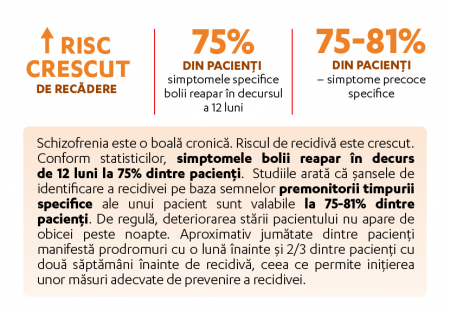 Schizofrenia este o boală cronică. Riscul de recădere este crescut. Conform statisticilor, simptomele bolii reapar în decurs de 12 luni la 75% dintre pacienți. Riscul de recădere scade semnificativ dacă se continuă tratamentul farmacologic în conformitate cu recomandările medicului.